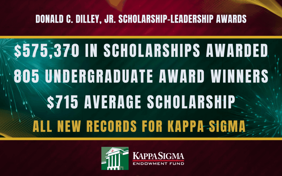 The Kappa Sigma Endowment Fund today announced new RECORDS across all major undergraduate scholarship categories, with $575,370 in 2025 Donald C. Dilley, Jr. Scholarship-Leadership Awards, representing a 14% increase over last year’s total.